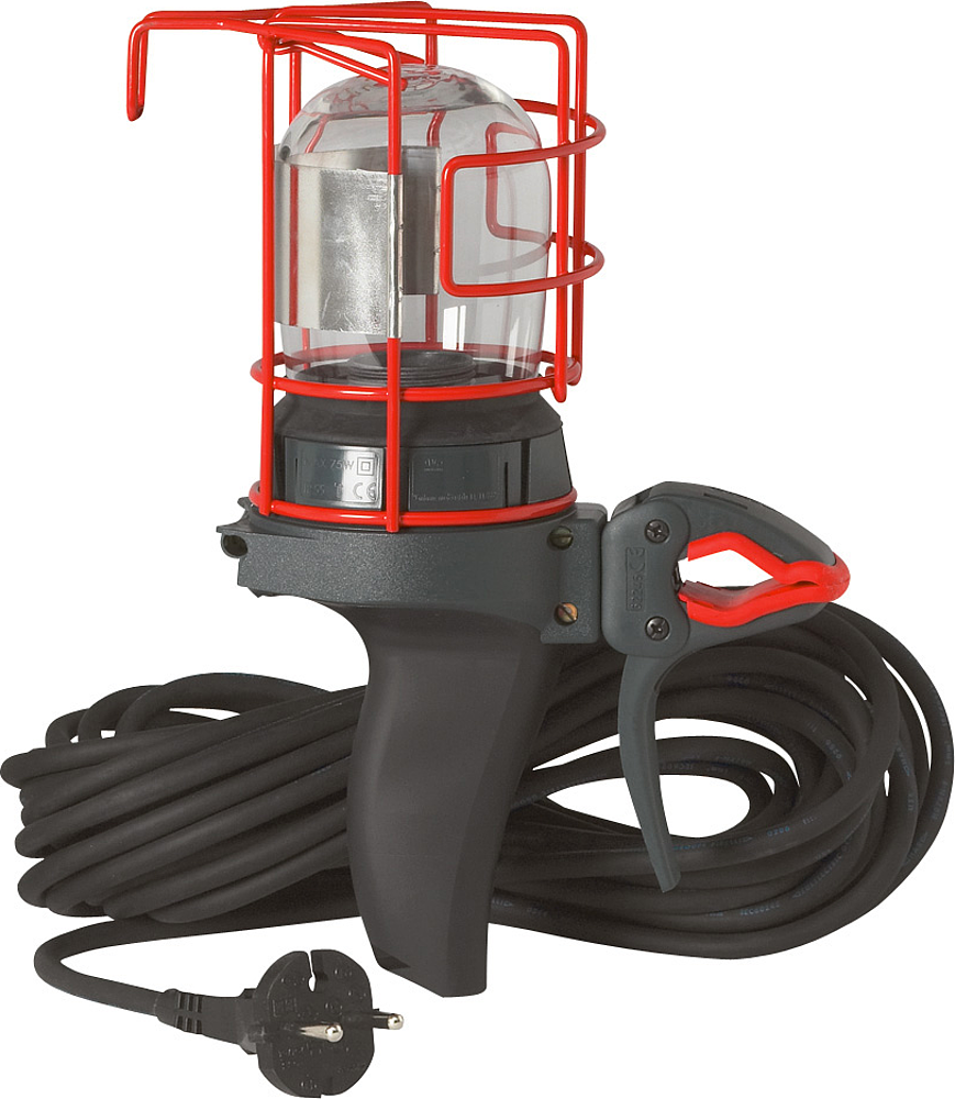 Baladeuse chantier 230V 75W maximum IP55 avec pince orientable, interrupteur, fiche 2P et cordon 10m - panier rotatif acier et revêtement de protection et poignée caoutchoutée et verrine en verre trempé -livré avec lampe à filament renforcé