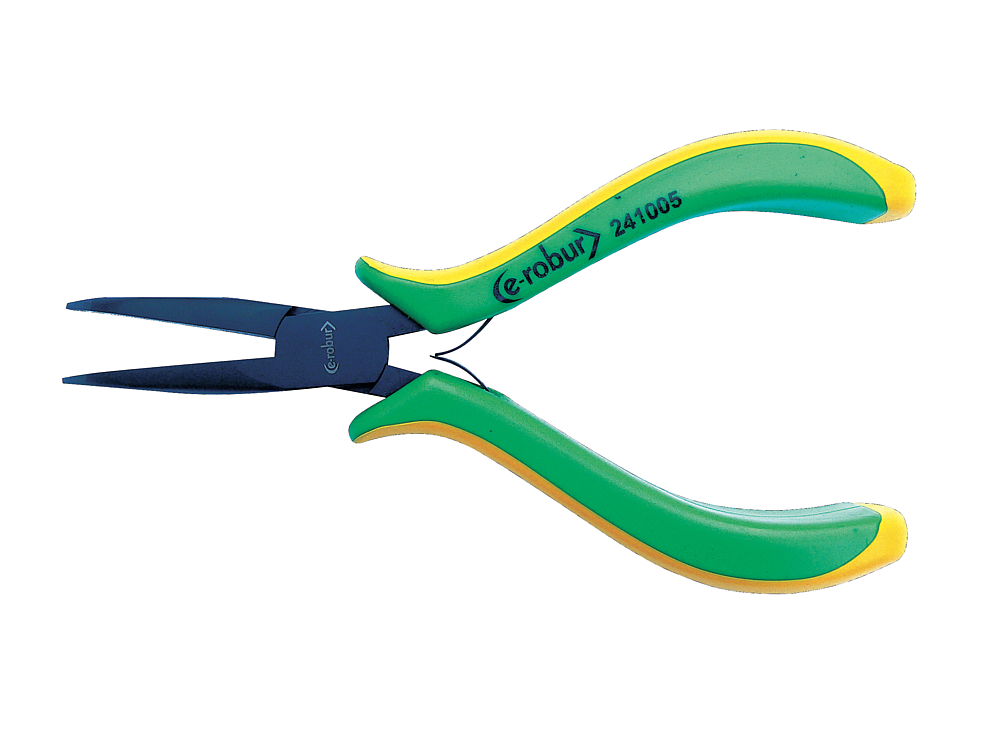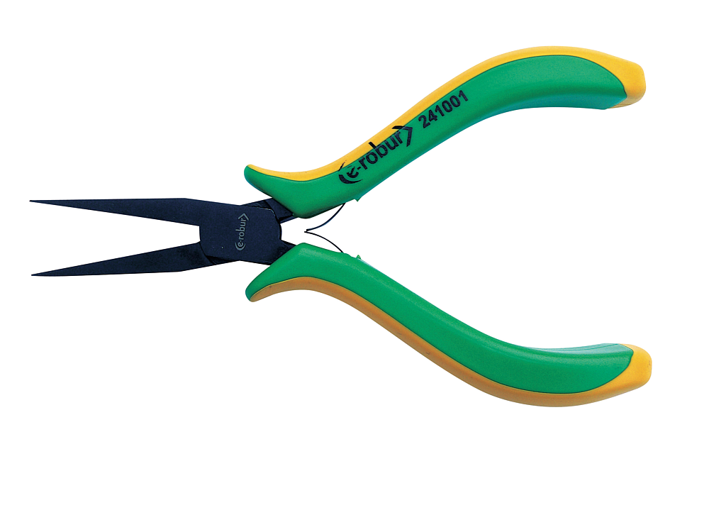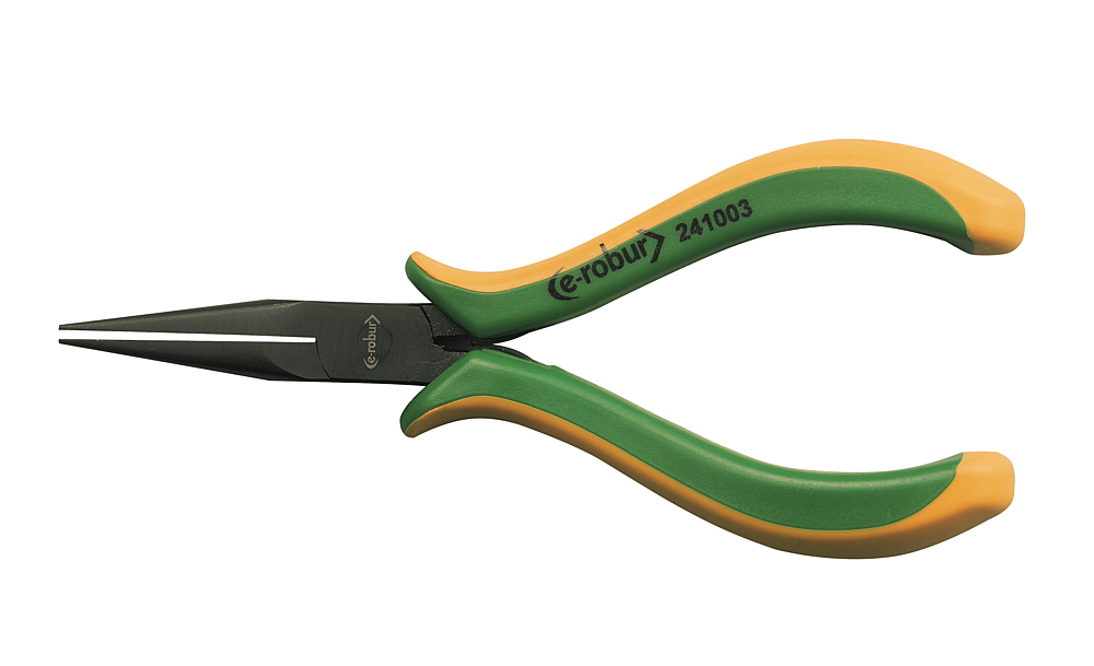 Pince électronique à becs 1/2 ronds. Manches bimatière confortables et antidérapants. Outil en acier allié entièrement trempés. Maillure entrepassée. Finition polie noire brillante.